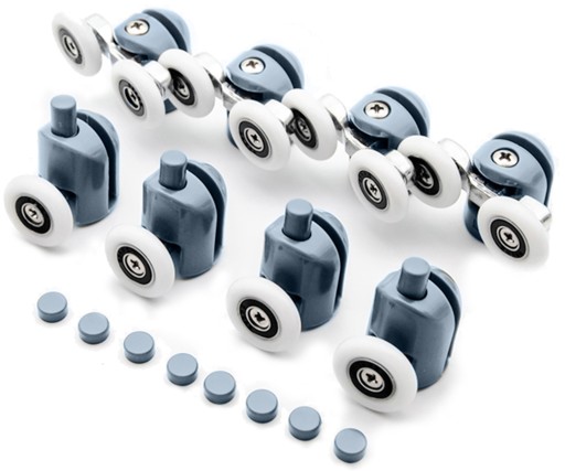 - UNIWERSALNE – rolki zostały wykonane z tworzywa sztucznego, nylonu oraz stali odpornej na korozję. Pasują do wszystkich kabin prysznicowych w których zastosowano tego typu łożyska kulkowe. Rolki wraz z kółkami dopasowują się do kształtu prowadnicy.