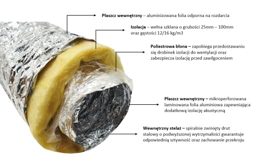 Przewód posiada wełnę mineralną odpowiedniej grubości. Zastosowana zakładka gwarantuje wysoką szczelność oraz brak strat ciepła.