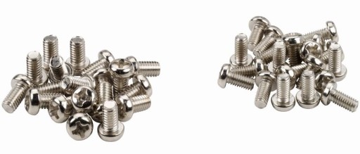 Stalowe śrubki o długości 6 mm w dwóch rozmiarach gwintu, przeznaczone do montażu większości dysków twardych HDD, stacji FDD, napędów CD, DVD oraz innych peryferii komputerowych.