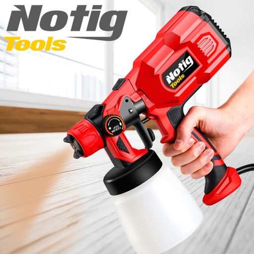 Elektryczny pistolet do malowania marki Notig Tools został wyposażony w wytrzymały i wydajny silnik o mocy 550 W. Urządzenie umożliwia nanoszenie farb o różnych gęstościach, farby na bazie wody, rozpuszczalnika, lakiery, podkłady, farby wykończeniowe, uszczelniające czy do gruntowania drewna. Dzięki natryskowi można pomalować szybko i dokładnie trudno dostępne miejsca, umożliwia równomierne pokrycie farbą nieregularnych powierzchni. Odpowiedni strumień otrzymujemy obracając dyszą. Dzięki wbudowanej sprężarce nie wymaga zewnętrznego zasilania sprężonym powietrzem. Włącznik w spuście pistoletu posiada regulacją przepływu farby.