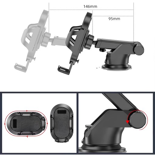 Uchwyt jest bardzo prosty w montażu zarówno do szyby samochodu jak i na deskę rozdzielczą czy inne elementy