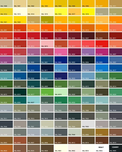 Ważne!!! Kolor dobierany jest z palety RAL (wzornik widoczny na zdjęciu) wedle życzenia klienta. Po zakupie proszę w wiadomości do sprzedającego („ważne informacje dla sprzedającego”) podać wybrany nr koloru.