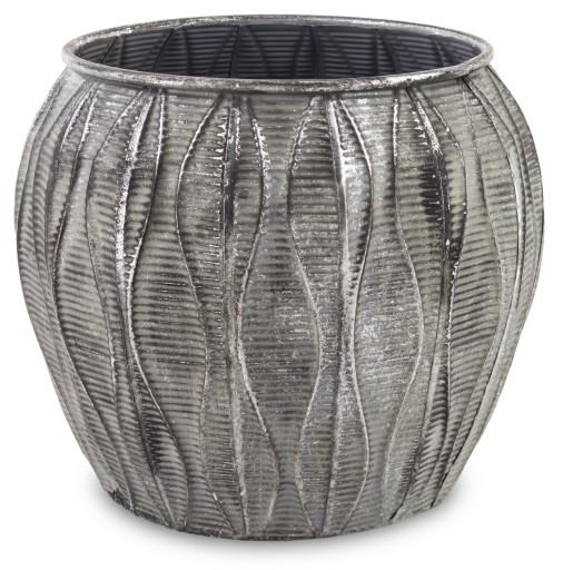 Klasyczny kształt uzupełniono zachwycającym wzorem. Osłonka posiada przepiękny kolor w odcieniach srebra. Posiada ona celowe postarzenia, przetarcia. Prezentowany model stworzono z myślą o dekoracji wnętrz i przestrzeni ogrodu w stylu klasycznym, nowoczesnym i mieszanym. Osłonki nada się na kompozycje z kwiatów żywych, suszonych i sztucznych.