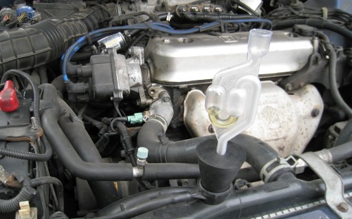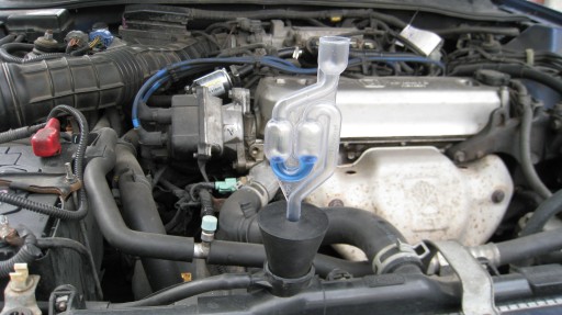 W przypadku uszkodzonej uszczelki pod głowicą lub głowicy część gazów spalinowych zawierających m.in. CO2 trafia do układu chłodzenia. Zasada działania przyrządu opiera się na pomiarze stężenia CO2 - w przypadku zwiększonego stężenia, płyn reakcyjny wchodzi w reakcję z CO2 i zmienia barwę.