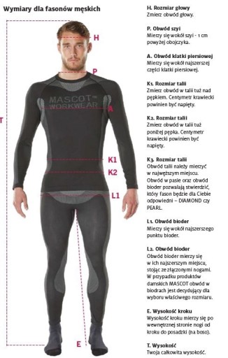 Szukając odpowiedniego rozmiaru najdokładniejszy pomiar uzyskasz, jeżeli zmierzy Cię ktoś inny. Pomiary należy wykonywać blisko ciała. Pamiętaj również o zmierzeniu długości nogawek. W większości spodni MASCOT możesz wybierać pomiędzy trzema długościami nogawek