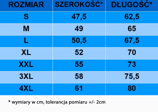 Zazwyczaj sprawdza się rozmiar który nosisz w przypadku innych koszulek. Jeśli nosisz koszulki w dwóch rozmiarach, wybierz u nas ten większy rozmiar.