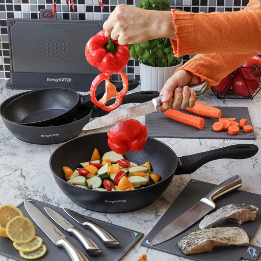 Głęboka patelnia non-stick Konighoffer Corvos 24 x 6,5 cm może być używana na indukcji oraz kuchenkach gazowych, ceramicznych i elektrycznych. Jej aluminiowy korpus został wykuty na gorąco. Dzięki temu jest dobrze wyważona, ciężka i ma solidne ścianki. Ma też dużo wyższą wytrzymałość na wysoką temperaturę i uszkodzenia. Zastosowana powłoka AEROLITE non-stick (grubość 50-65 mikrometrów) została specjalnie wzbogacona i jest PFOA Free. Jest też twardsza niż standardowe powłoki 2-warstwowe zapobiegające przywieraniu i przypalenia składników. Jej wytrzymałość sięga 50 000 cykli ścierania – jeden z lepszych wyników w skali światowej. Na patelni Corvos usmażysz, co tylko chcesz na małej ilości masła lub oliwy. Wygodnie zamieszasz składniki, a także umyjesz produkt. Nowoczesne wzornictwo gustownie wzbogaci twoją kuchnię – to prosta droga do komfortu tworzenia dietetycznych i lekkostrawnych posiłków. Rączka soft touch pokryta jest warstwą silikonu i ma antypoślizgową powierzchnię. Jej konstrukcja nie nagrzewa się i dobrze chroni przed oparzeniem. Produkt ma rekomendację Ewy Wachowicz. Jako ambasadorka marki Konighoffer, gorąco i z uśmiechem poleca go ona do domowego użytku. Razem z nim zdobędziesz twój przepis na dom. To jedna z najlepszych opcji w tej kategorii!