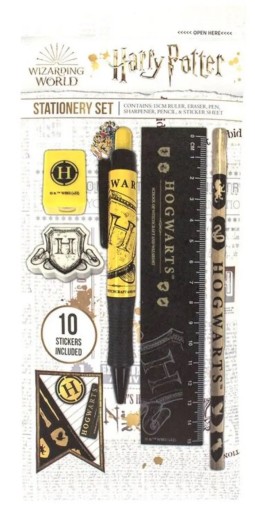 Różdżka - sprawdzone! Miotła - sprawdzone! Materiały piśmiennicze... Artykuły papiernicze!? Nie zawiedź się brakiem klasowych niezbędników. Ten zestaw przyborów piśmienniczych Harry Potter Hogwarts Shield z pewnością sprawi, że magia będzie płynąć dla każdego ucznia zapisującego się do Hogwartu w tym roku. Zestaw przyborów piśmienniczych zawiera pióro, ołówek, temperówkę, gumkę, linijkę 15cm i 10 fajnych naklejek - wiesz, dla zabawy! Nasz zestaw piśmienniczy inspirowany Hogwartem jest oficjalnie licencjonowany przez Warner Bros. i dostarczany jest w markowym opakowaniu Harry Potter.