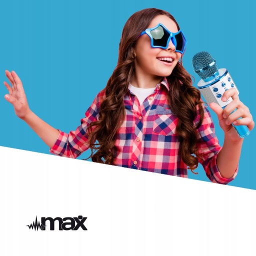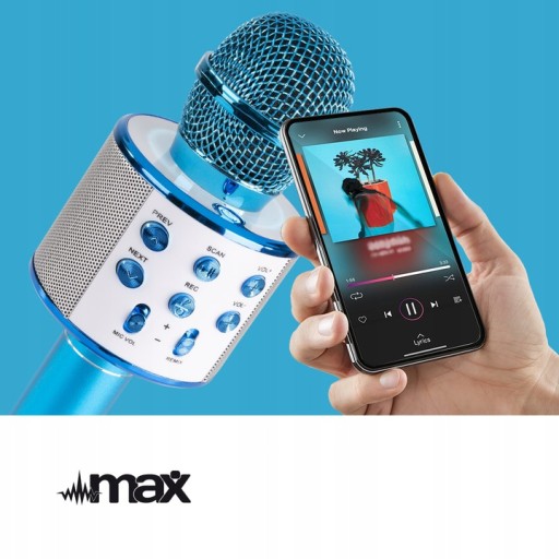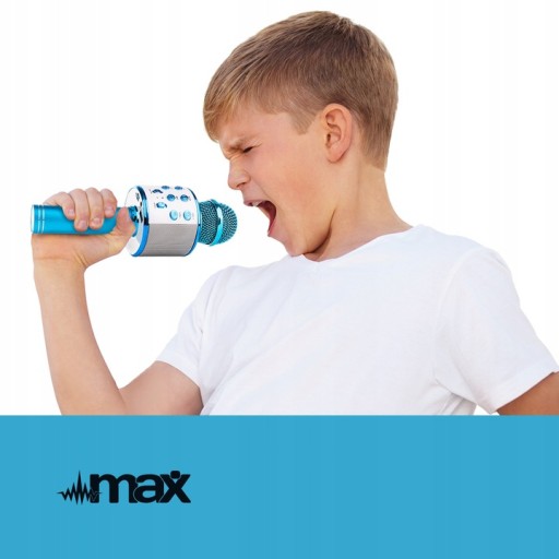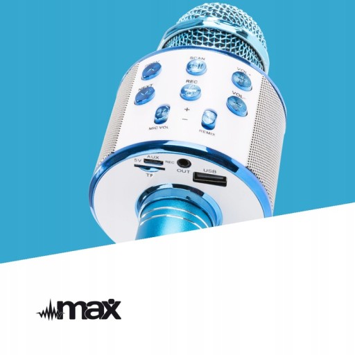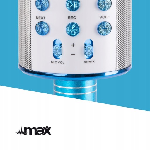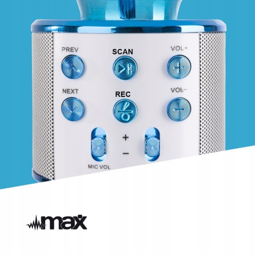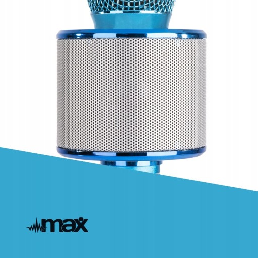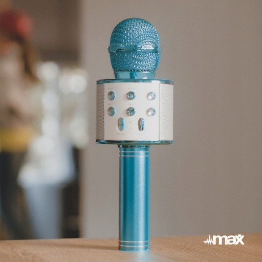 MAX KM01 to niebieski mikrofon karaoke z wbudowanym wzmacniaczem i głośnikiem.
