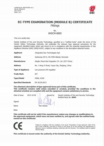 Reduktor może być zastosowany do butli o nominalnej zawartości gazu do 11kg. Typ A300i , CE-0845 EN16129