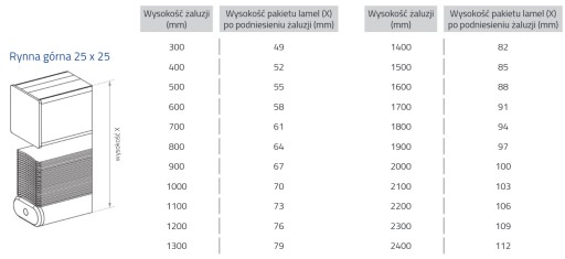 TABELA POKAZUJĄCA ILE MIEJSCA ZAJMUJE ŻALUZJA PO ZŁOŻENIU