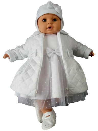 JESIENNY KOMPLET DO CHRZTU, PIKOWANY PŁASZCZYK PRZEJŚCIOWY KAROLINKA z czapeczka, rozmiar 74