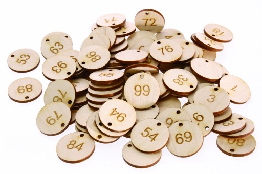 Drewniane żetony o średnicy 5 cm z wygrawerowanym numerkiem od 1 do 100.