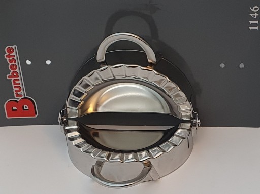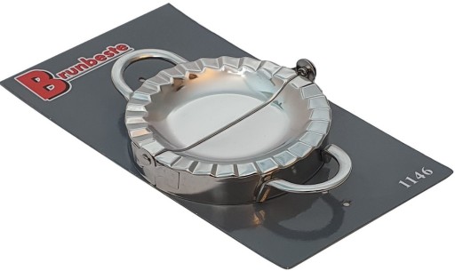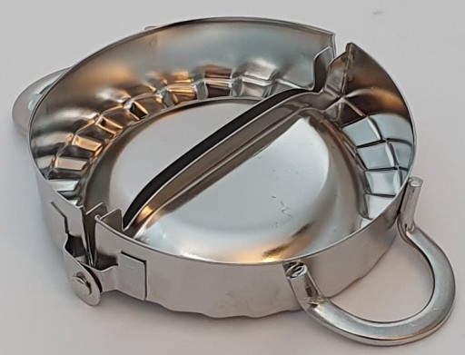 Forma do przygotowania pierogów została wykonana ze stali nierdzewnej. Pomoże nam przygotować pyszne pierogi. Dolną częścią urządzenia wykroimy z ciasta kółka. Potem przekładamy wykrojone kółka na wierzch formy, nakładamy farsz i po zamknięciu maszynki uzyskujemy dekoracyjne pierogi.