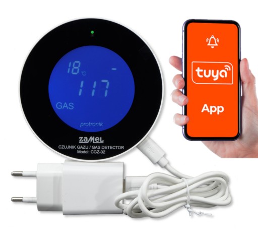 Czujnik gazu CGZ-02 służy do ciągłego monitorowania obecności gazów wybuchowych (ziemnego i propan-butan) w powietrzu. Wyposażony jest w wyświetlacz LED pokazujący aktualne stężenie gazu oraz dodatkowo temperaturę otoczenia. Czujnik może pracować niezależnie ale dzięki wbudowanemu modułowi WiFi i darmowej aplikacji TUYA można uzyskać zdalny dostęp do czujnika. Dzięki temu w razie wystąpienia alarmu użytkownik otrzyma powiadomienie na swoim telefonie.