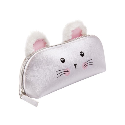 Przedstawiamy kosmetyczkę myszkę, stworzoną specjalnie dla dziewczynek. Ma jasno-szary kolor, nadrukowany mysi pyszczek i pełne uroku, pluszowe uszka. Może z powodzeniem służyć też jako szkolny piórnik.