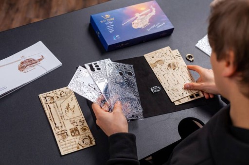 Zestaw do budowy modelu helikoptera Valkyrja, który jest połączeniem wysokiej jakości tworzywa sztucznego i eleganckiego drewna. Wykorzystanie tych dwóch materiałów pozwoliło na zaprojektowanie lekkiej, solidnej i bardziej wytrzymałej konstrukcji. Dzięki wykorzystaniu nowoczesnej technologii, model jest wierną kopią oryginału i posiada wiele ruchomych elementów, takich jak: śmigła, ogon, drzwi i drzwi. Zestaw ma postać arkuszy z wstępnie wyciętymi i ponumerowanymi elementami, które przed montażem, należy oddzielić od wykroju, a następnie połączyć bez użycia kleju, zgodnie ze szczegółową instrukcją dołączoną do opakowania. Model zaprojektowany i wykonany w Europie.