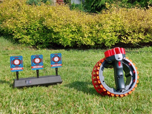 Tarcza Elektroniczna sprawi, że Twoje dziecko chętniej będzie spędzać czas aktywnie i w gronie rówieśników. Zabawa w strzelanie do 3 celów umieszczonych w tarczy dostarcza mnóstwo frajdy. Tarcza została wyposażona w wyświetlacz LCD, który wyświetla zdobyte punkty. Po ustrzeleniu wszystkich celi – automatycznie podnoszą się do góry. Po trafieniu w jeden z trzech celi, urządzenie wydaje z siebie odgłosy zbitego szkła lub strzału, które zdecydowanie dodają zabawie autentyczności.