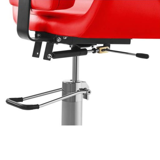 Duże siedzisko o wymiarach 54 x 47 cm zostało optymalnie wyprofilowane. Obraca się o 360o, co zwiększa komfort eksploatacji. W środku znajduje się wysokiej jakości pianka odporna na deformacje, która pozytywnie wpływa na wygodę obsługiwanej osoby. Dopasowanie do wzrostu klienta zapewnia zagłówek (regulacja od 0 do 18 cm). Fotel fryzjerski może być używany zarówno w złożonym, jak i rozłożonym ustawieniu, co pozwala klientowi przyjąć półleżącą pozycję