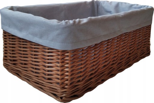 Kosz wiklinowy w kolorze naturalnej wikliny z szarym obszyciem bawełnianym.