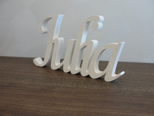 Ręcznie wykonany napis stojący z sklejki pomalowane na biało, ma ok 12,5 cm wysokości i grubości 1,8 cm. Długość napisu uzależniona będzie od długości imienia.