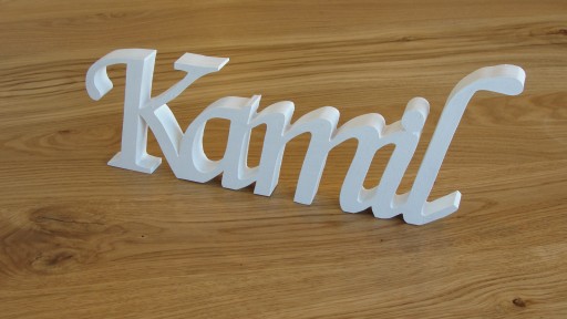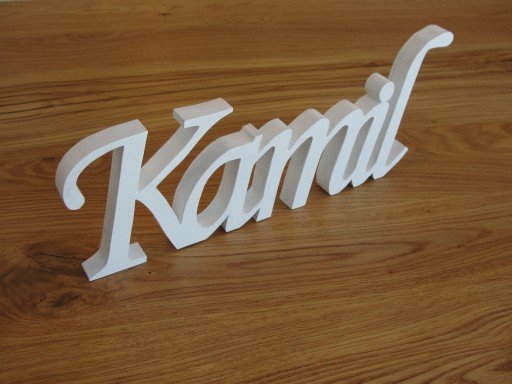 Ręcznie wykonany napis stojący z sklejki pomalowane na biało, ma ok 12,5 cm wysokości i grubości 1,8 cm. Długość napisu uzależniona będzie od długości imienia.