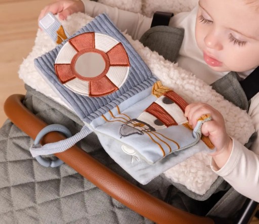 Książeczka sensoryczna Little Dutch z kolekcji Sailors Bay. Zawiera w środku różnorodne faktury, materiały dzięki którym maluszek może stymulować swoje zmysły. Książeczka posiada uwielbiane przez maluchów lustereczko, metki oraz piszczałkę i szeleścika. Książeczka wspomaga koordynację ręka-oko. Można ją przymocować za pomocą kółeczka do wózka, gondoli lub fotelika samochodowego. Stanowi uzupełnienie dla pozostałych produktów z kolekcji Sailors Bay.
