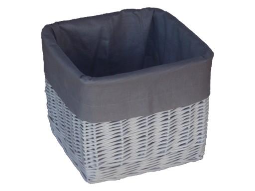 Kosz wiklinowy białym z obszyciem bawełnianym w kolorze stalowym.