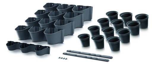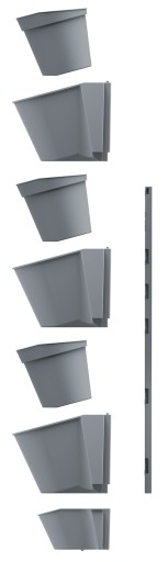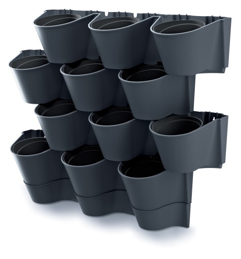 To zestaw 12 doniczek, w formie segmentów, które możesz zawiesić na ścianie lub ustawić na podłodze. Daje nam wygodę podlewania, ponieważ jest skonstruowany w taki sposób, aby woda z górnych doniczek spływała na poniższe segmenty, aż do podstawki. W ten sposób wszystkie rośliny zostaną zasilone wodą, bez przelania ich systemu korzeniowego. Zestaw możesz podłączyć do węża nawadniającego, który samodzielnie będzie podlewał rośliny. Segmenty możesz łączyć, tworząc jeszcze większe i szersze zielone ściany.