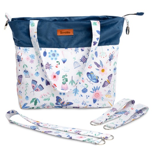 Torba w środku posiada przegrodę, która pomaga zorganizować przybory, tak aby można było je łatwo odnaleźć oraz 2 kieszonki. Torba została wyposażona w paski na ramię, jeden długi pasek oraz dwa uchwyty pozwalające na przymocowanie torby do rączki wózka.