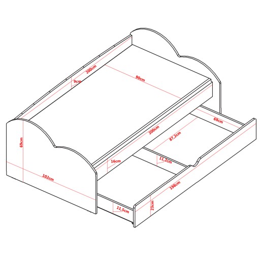 - Łóżko Standard - Powierzchnia spania: 200 cm x 90 cm, wymiar całkowity: 204 cm x 102 cm x 69 cm