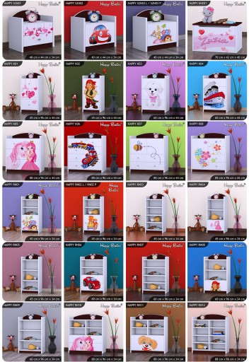 Każdy z mebli może być wykonany z motywami dostępnymi na łóżeczkach.