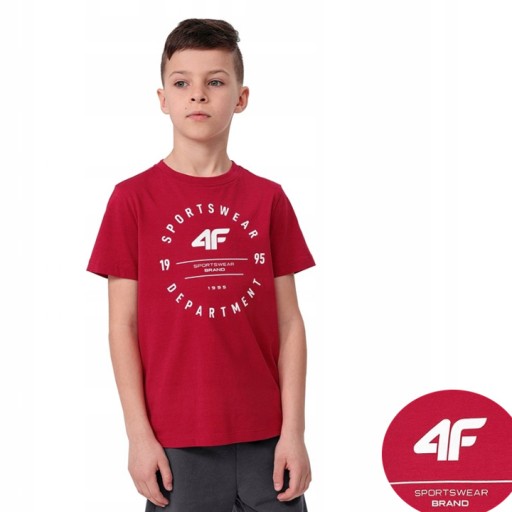 Koszulka chłopięca 4F z krótkim rękawem, z dużym logiem z przodu i napisami, oraz małym logiem z tyłu. W kolorze producenta - CZERWONY.