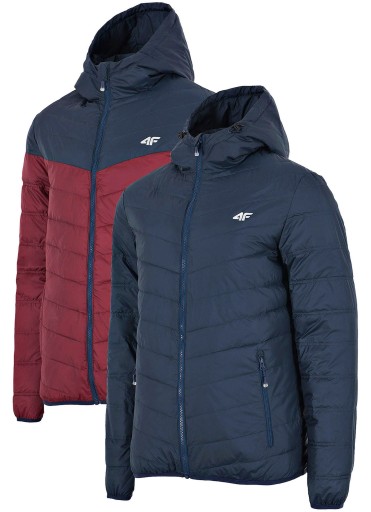 Dwustronna męska kurtka puchowa z kapturem posiada wypełnienie z puchu syntetycznego i powłokę impregnacyjną w technologii DWR, dzięki czemu zapewni ciepło i usprawni ochronę przed nadmiernym wchłanianiem wilgoci podczas zmiennych warunków atmosferycznych.