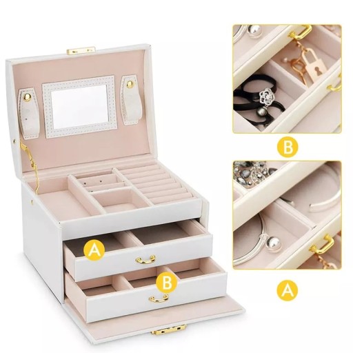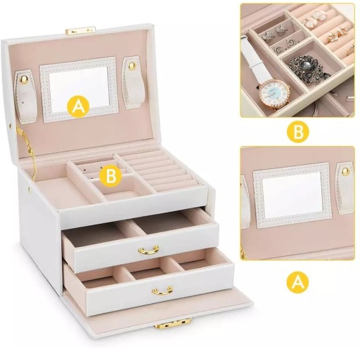 Praktyczna szkatułka posiada 20 rożnych przegródek i wgłębień, dzięki którym zapanujesz nad porządkiem swojej kolekcji. Kuferek oprócz przegródek posiada także 2 wysuwane niezależnie szufladki. Przegródki mają różne rozmiary i sprawdzą się zarówno do chowania zegarków, bransoletek, łańcuszków, jak i kolczyków, a nawet monet czy pendrive z ważnymi danymi. Na środku znajduje się także lusterko idealne przy wkładaniu kolczyków lub innej biżuterii.