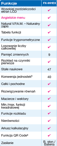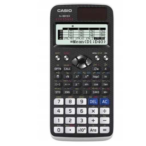 Kalkulator naukowy Casio FX-991CEX wyposażony w wyświetlacz o rozdzielczości 192 x 63. Zasilany za pomocą jednej baterii LR44 lub ogniwa słonecznego. Seria ClassWiz oferuje nowy ciekłokrystaliczny ekran, który jest cztery razy większy od znanej serii FX-EX Plus. Serię ClassWiz wyposażono dodatkowo w nowy szybszy procesor i podwojoną pamięć. Kalkulator obsługuje naturalny zapis, macierze 4x4, obliczenia na wektorach, całki oraz pochodne. Po raz pierwszy w kalkulatorach naukowych serii CLASSWIZ zastosowano ARKUSZ KALKULACYJNY pozwalający wykonywać podstawowe obliczenia charakterystyczne dla arkuszy. Arkusz może mieć wielkość 5 kolumn / 45 wierszy.
