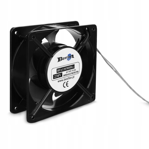 Wentylator do kominka 120x120x38mm 230v BESTFAN na łożysku kulkowym. Bardzo dobrze spełnia swoją funkcję przy wyciąganiu ciepłego powietrza lub nadmuchu zimnego powietrza pod kominkiem. Wentylatory te montuje się na końcach kanałów z ciepłym powietrzem. Wtedy wyciągają ciepłe powietrze z przewodów i wdmuchują je do pomieszczenia. Można podłączać pod nie różne sterowniki jak regulatory obrotów czy termostaty.