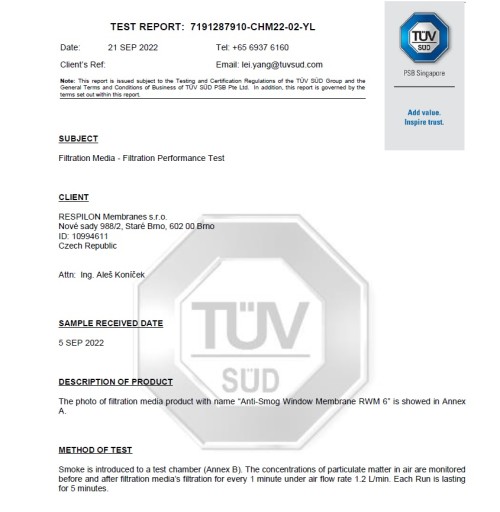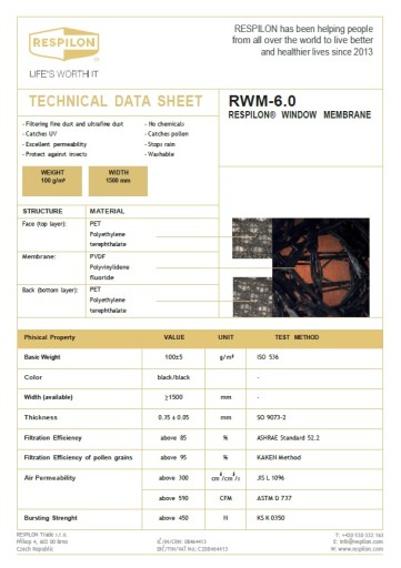 Unikalną zdolność filtrowania membrany zapewnia warstwa nanowłókien zamknięta wewnątrz membrany. Technicznie Membrana okienna RESPILON to trójwarstwowy laminat zawierający oddychającą siateczkę i warstwę nanowłókien. Elementy tkaniny użyte w membranie są sterylizowane przed promieniowaniem UV. Kompaktowość zapewnia materiał laminowanie. Membrana okienna RESPILON nadaje się do stosowania w gospodarstwach domowych alergików, astmatyków, a także osoby z zaburzeniami sercowo-naczyniowymi choroby płuc, które mieszkają na obszarach lub regionach o wysokim poziomie zanieczyszczenia powietrza.