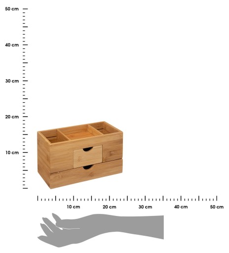 Pudełko do przechowywania to przedmiot, który umożliwi uporządkowanie cennej biżuterii, a także spinek do włosów czy innych drobiazgów. Szkatułka wykonana została z drewna bambusowego co czyni ją solidną i daje gwarancję, że posłuży przez długi czas. Pojemnik posiada dwie szufladki i trzy mini półeczki, które pomieszczą sporą ilość drobnych przedmiotów. Pudełko dzięki swojemu nowoczesnemu designowi i dobrze dobranej kolorystyce stanowi świetny dodatek w każdym rodzaju wnętrz. Szkatułka będzie wyśmienitym pomysłem na prezent.