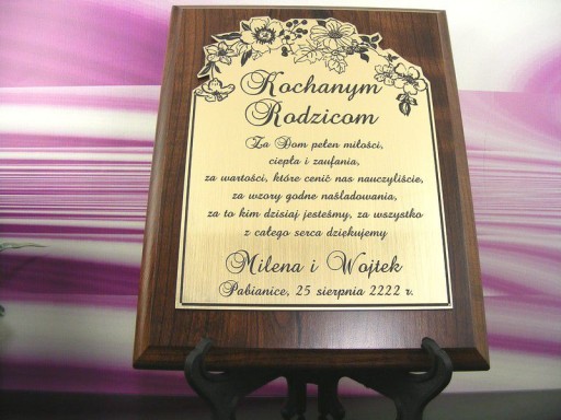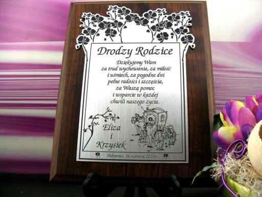 Piękne podziękowanie wykonywane jest w technologii grawerowania laserowego na złotym lub srebrnym laminacie który będzie wklejony na dyplom. Pięknie wykonana statuetka posiadająca podstawkę do jej prezentacji oraz frezy do zawieszenia na ścianie na pewno zapadnie w pamięć obdarowanej osobie. Tak wysokiej jakości nie znajdziesz nigdzie indziej. Mogę zrobić dla Ciebie - PREZENT NA DOWOLNĄ OKAZJĘ (ślub, wesele, chrzciny, komunia, urodziny, osiemnastka imieniny, jubileusz, rocznica ślubu, dzień matki i ojca, dzień dziadka i babci, walentynki, dzień nauczyciela itp).