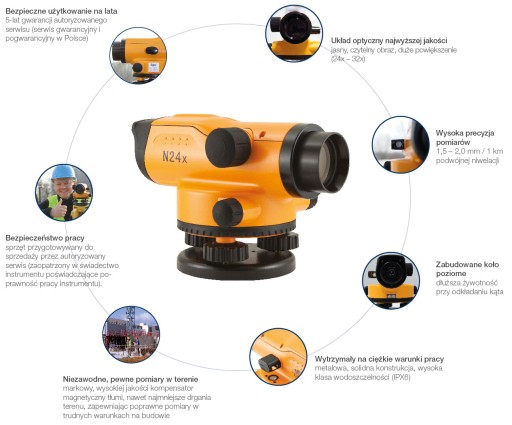 Niwelator optyczny Nivel System N24x to instrument do bardzo precyzyjnych pomiarów różnic wysokości. Niwelator wyposażono w wysokiej jakości optykę gwarantującą bardzo dobrą jakość obrazu (czytelny obraz). Magnetyczny kompensator umożliwia wykonywanie pomiarów na terenach niestabilnych, gdzie statyw z niwelatorem mogą być narażone na ciągłe drgania. Instrument jest odporny na pył i wodę i dzięki temu można nim pracować w ciężkich warunkach – podczas deszczu czy w środowisku mocno zapylonym. Niwelator przeznaczony jest m.in. dla geodetów, drogowców, budowlańców, archeologów – dla wszystkich specjalistów, którzy wymagają od instrumentu pomiarowego najwyższej precyzji i niezawodności.