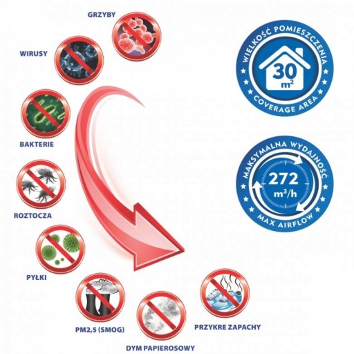 - funkcje: filtrowanie sierści / usuwanie bakterii / wirusów / usuwanie kurzu / roztoczy / usuwanie pyłków / alergenów / usuwanie smogu / usuwanie zapachów / usuwanie zarodników pleśni