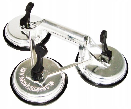 Potrójna przyssawka do szyb 3x120mm, wykonana z bardzo mocnej gumy, o średnicy 120mm i maksymalnym udźwigu 135 kg. Stosowana do przenoszenia elementów o płaskich, gładkich powierzchniach np. szyb okiennych, samochodowych, arkuszy blach, płytek ceramicznych, laminatów itp. Zapewnia mocny i pewny uchwyt. Korpus wykonany ze stopu aluminium, polerowany. Kolor uchwytu celowo dobrany tak, by łatwo było go odnaleźć w schowku z narzędziami.
