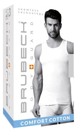BRUBECK COMFORT COTTON BEZSZWOWA PODKOSZULKA BEZ RĘKAWA DLA MĘŻCZYZN - bawełniane podkoszulki, majtki i kalesony firmy Brubeck tworzone są przy wykorzystaniu nowoczesnego parku maszynowego. Produkty nie są wykrawane "starymi" metodami z belki materiału, a następnie zszywane przez krawcowe, lecz powstają w postaci rękawa, a następnie poprzez płaski szew doszywane są rękawy i zszywane nogawki. Ten sposób produkcji sprawia, że PRZY BRAKU BOCZNYCH SZWÓW z jednej strony bielizna jest NIEWIDOCZNA POD UBRANIAMI, a z drugiej NIE POWSTAJĄ OTARCIA SKÓRY w miejscach najbardziej wrażliwych