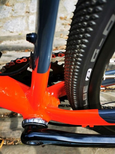 Całość wygląda bardzo przyjemnie dla oka i wzbudza spore zainteresowanie mijanych rowerzystów i rowerzystek. Na wyróżnienie zasługuje przejście kolorów na dolnej rurze, które też przejawia się w naklejkach na ramie.