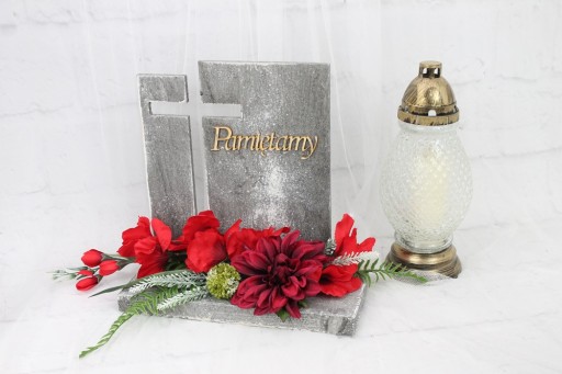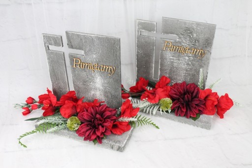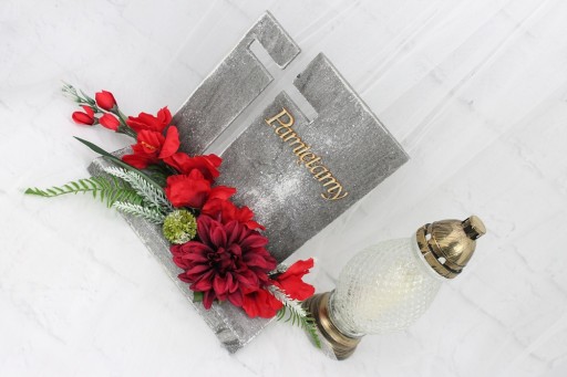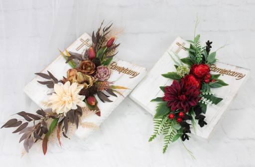 Wyjątkowa, niepowtarzalna i oryginalna kompozycja nagrobna wykonana z wysokiej jakości sztucznych kwiatów na drewnianej podstawie w formie tablicy