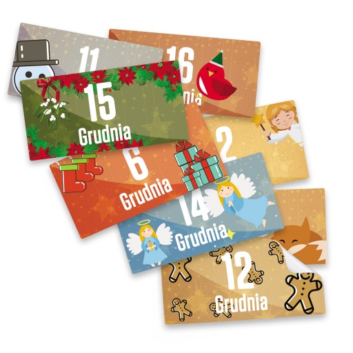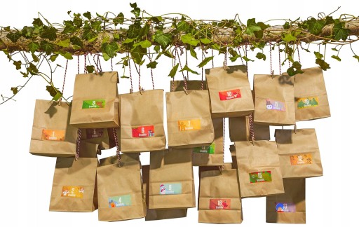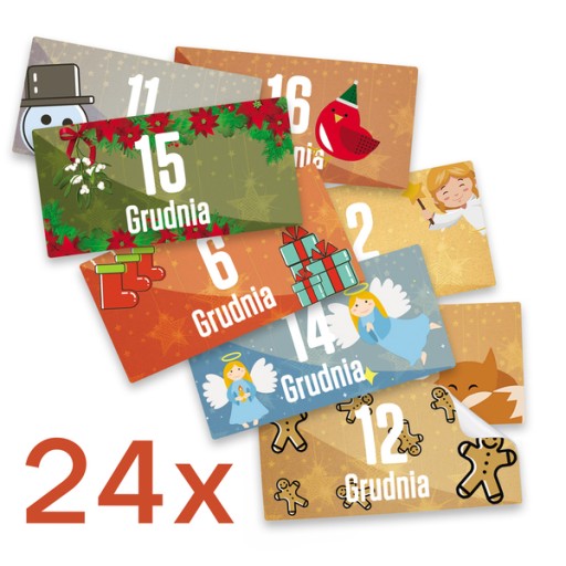 - 24 szt. ozdobnych, ponumerowanych naklejek na torebki