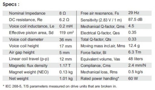 - basreflex z rurą o średnicy około 38 mm i długości 177 mm, objętość około 14 litrów dla F3 wynoszącego 50 Hz.