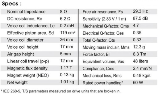 - 38 litrów w obudowie bassreflex 2\"x 6,3\" F3 = 36 Hz.