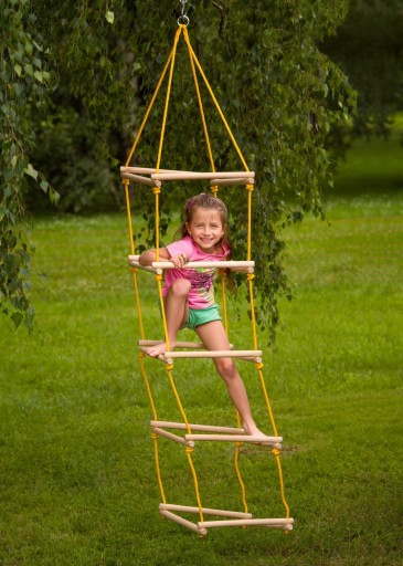 Oto sznurkowa wieża. Drabinka została wykonana na planie kwadratu tak, że dziecko może się po niej wspinać ćwicząc koordynację, ale nie tylko. Ćwiczenie sprawności, podnoszenie tężyzny i nabieranie siły jest bardzo ważne dla prawidłowego rozwoju naszych dzieci, o którym nie powinniśmy zapominać. Wspinanie się to również możliwość rozładowania energii i świetna zabawa.